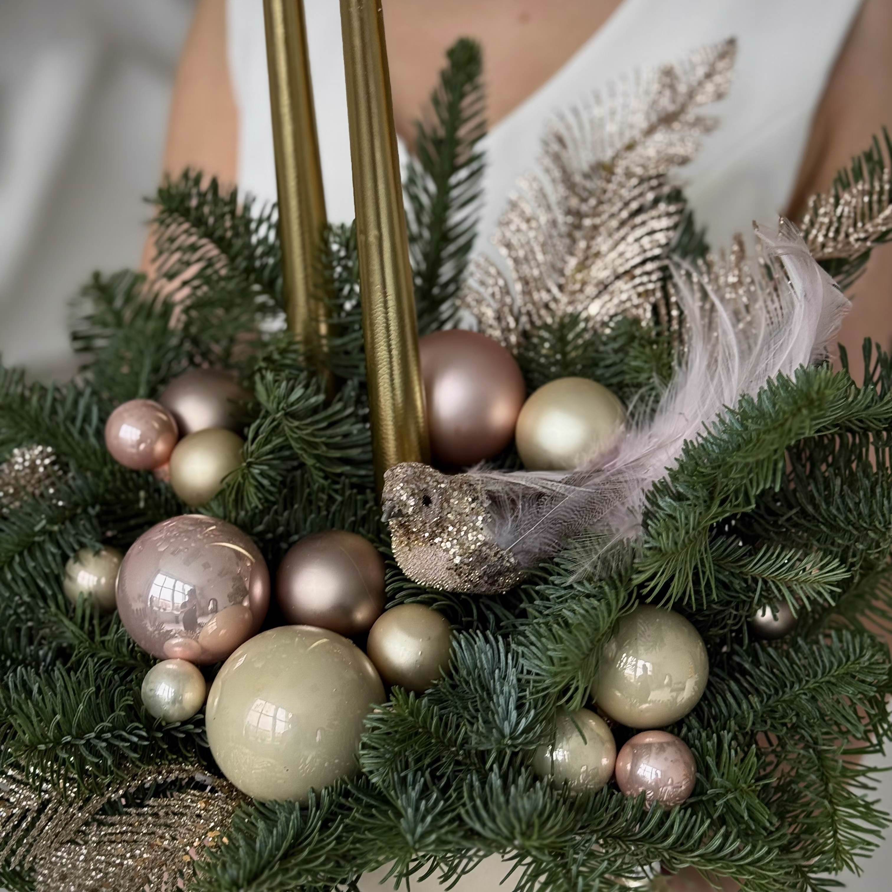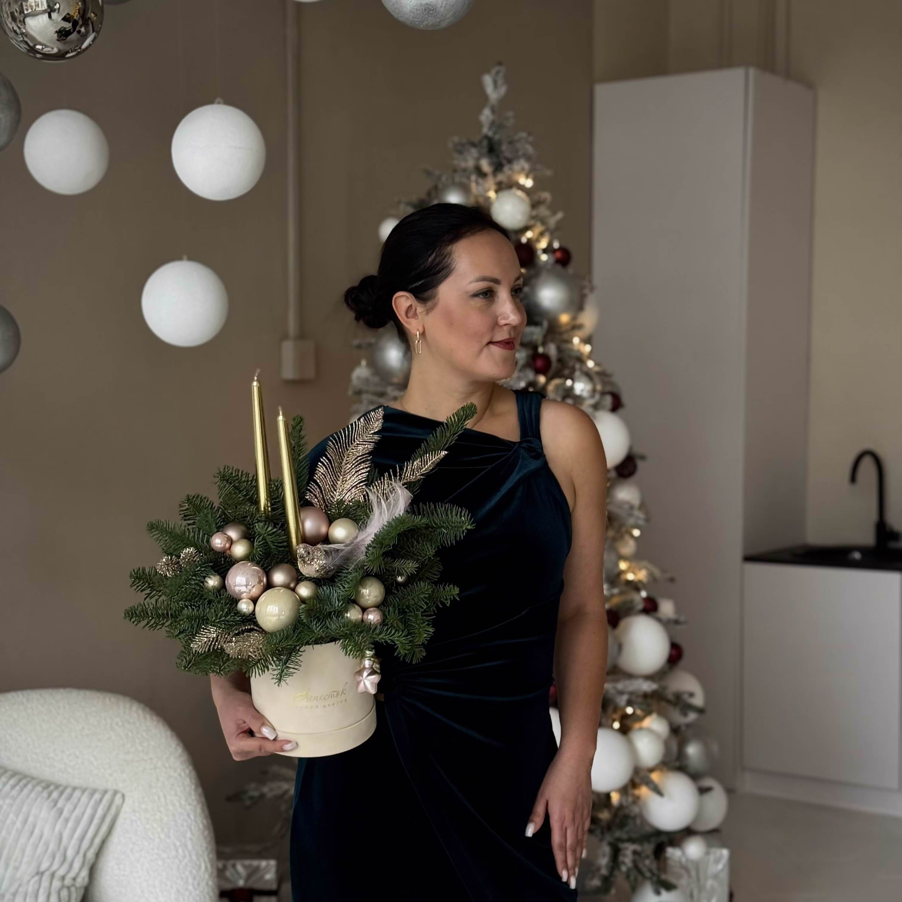Зимняя композиция в бархатном цилиндре со свечами и птичкой
