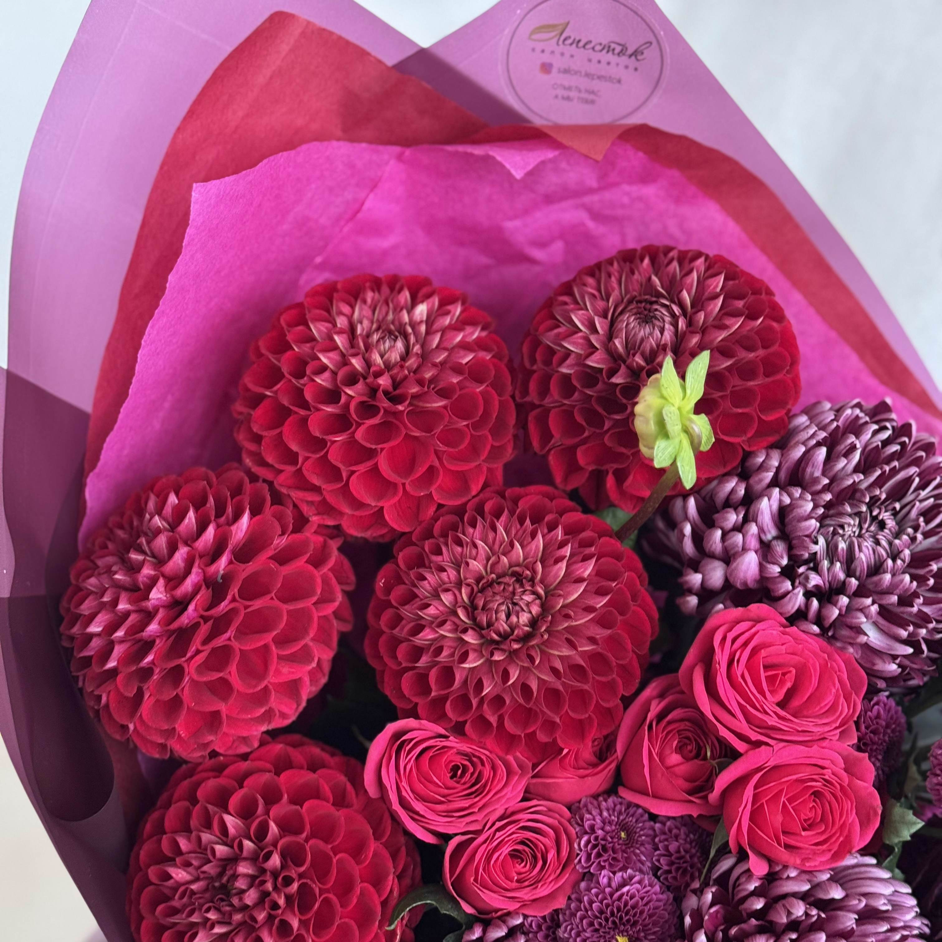 Букет из георгин, хризантем Бигуди и Сантини