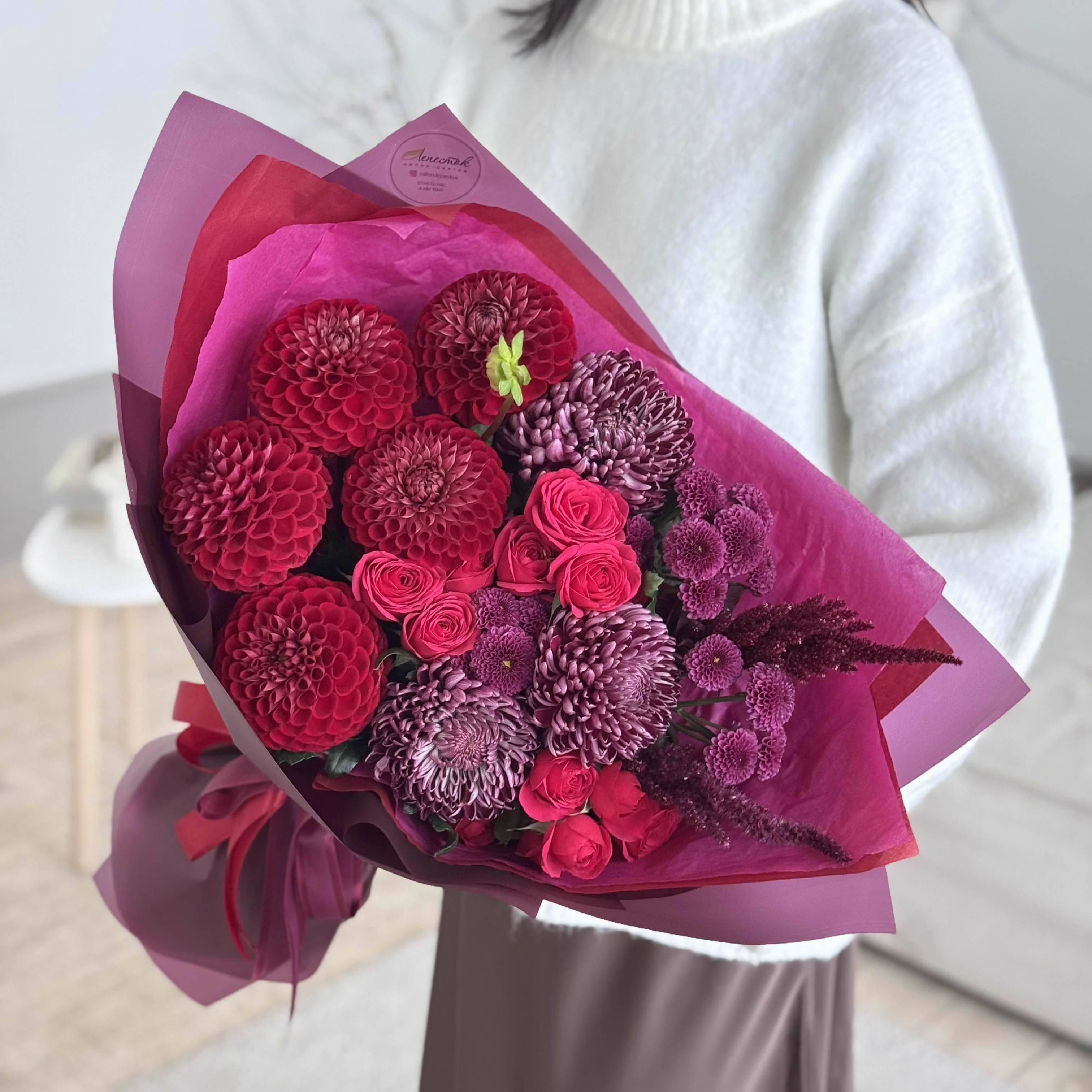 Хризантема Сантини, Роза кустовая Квинси (Quincy), Одноголовая хризантема Бигуди, Лента атласная, Стильная упаковка, Амарант, Георгин Корнел Ред (Cornel Red)