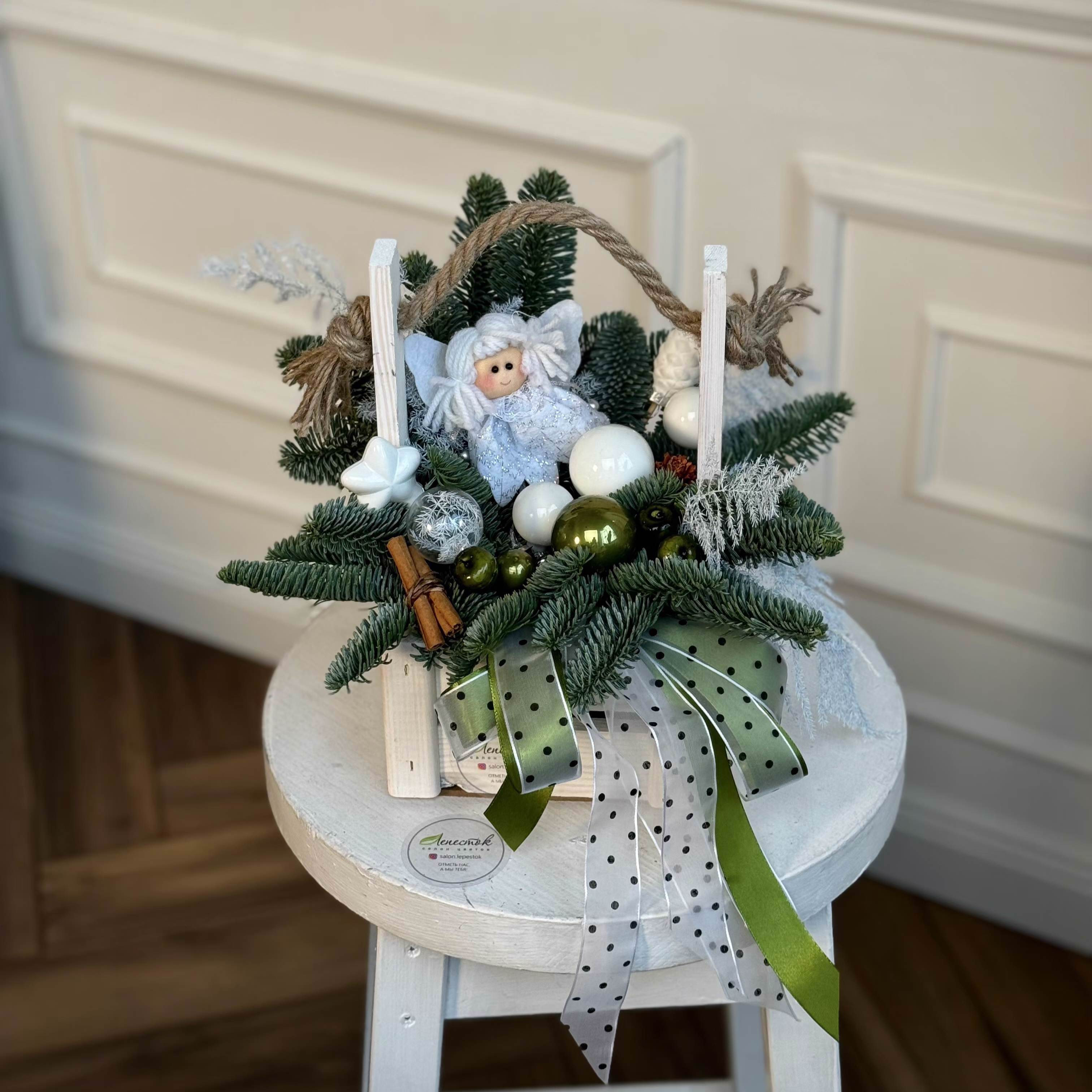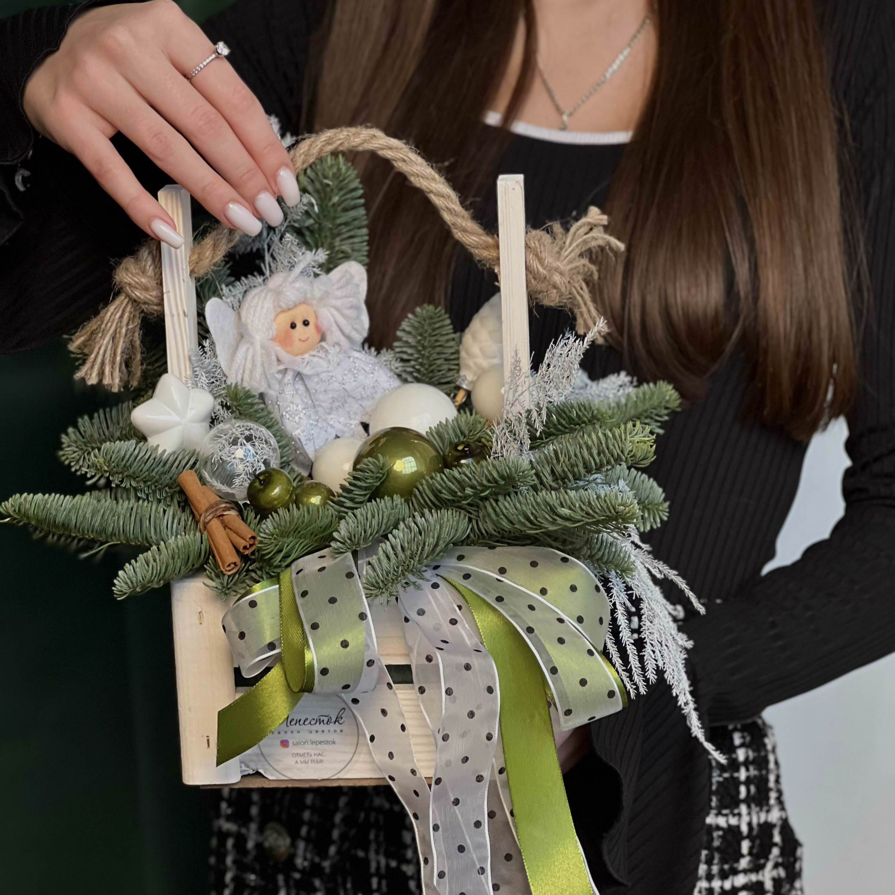 Ящик деревянный, Целлофан , Флористическая губка (Оазис), Нобилис, Аспарагус Белый, Лента атласная, Декор новогодний