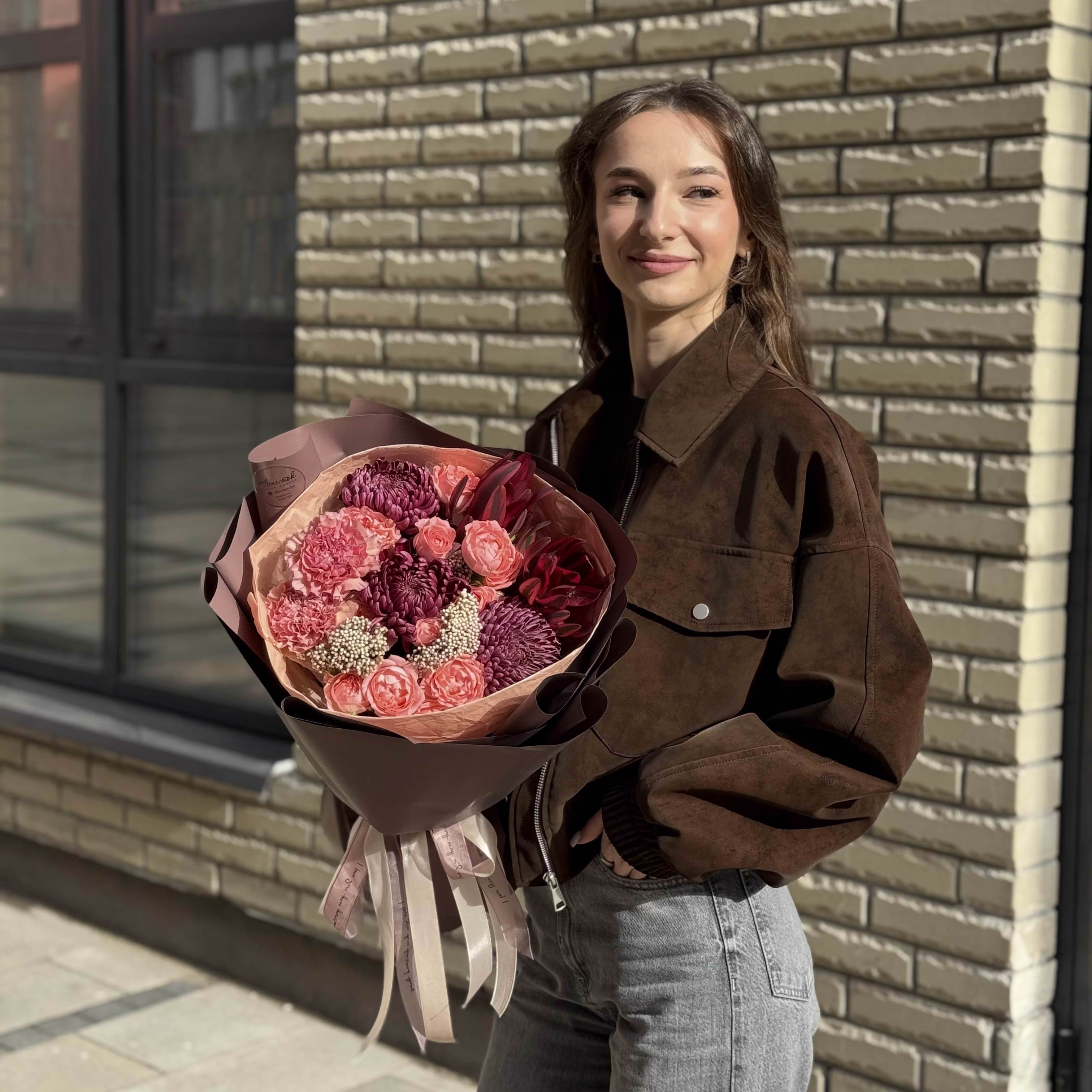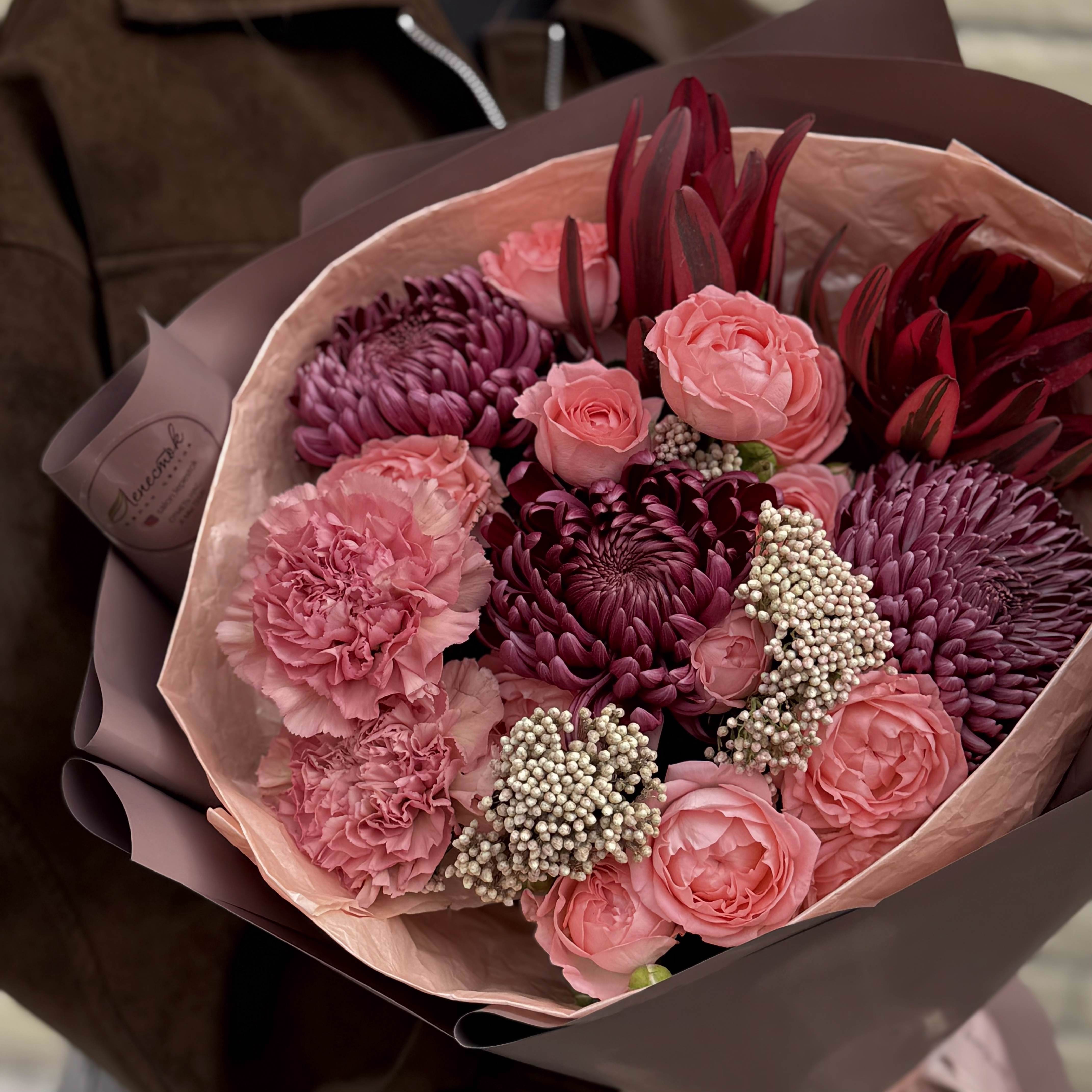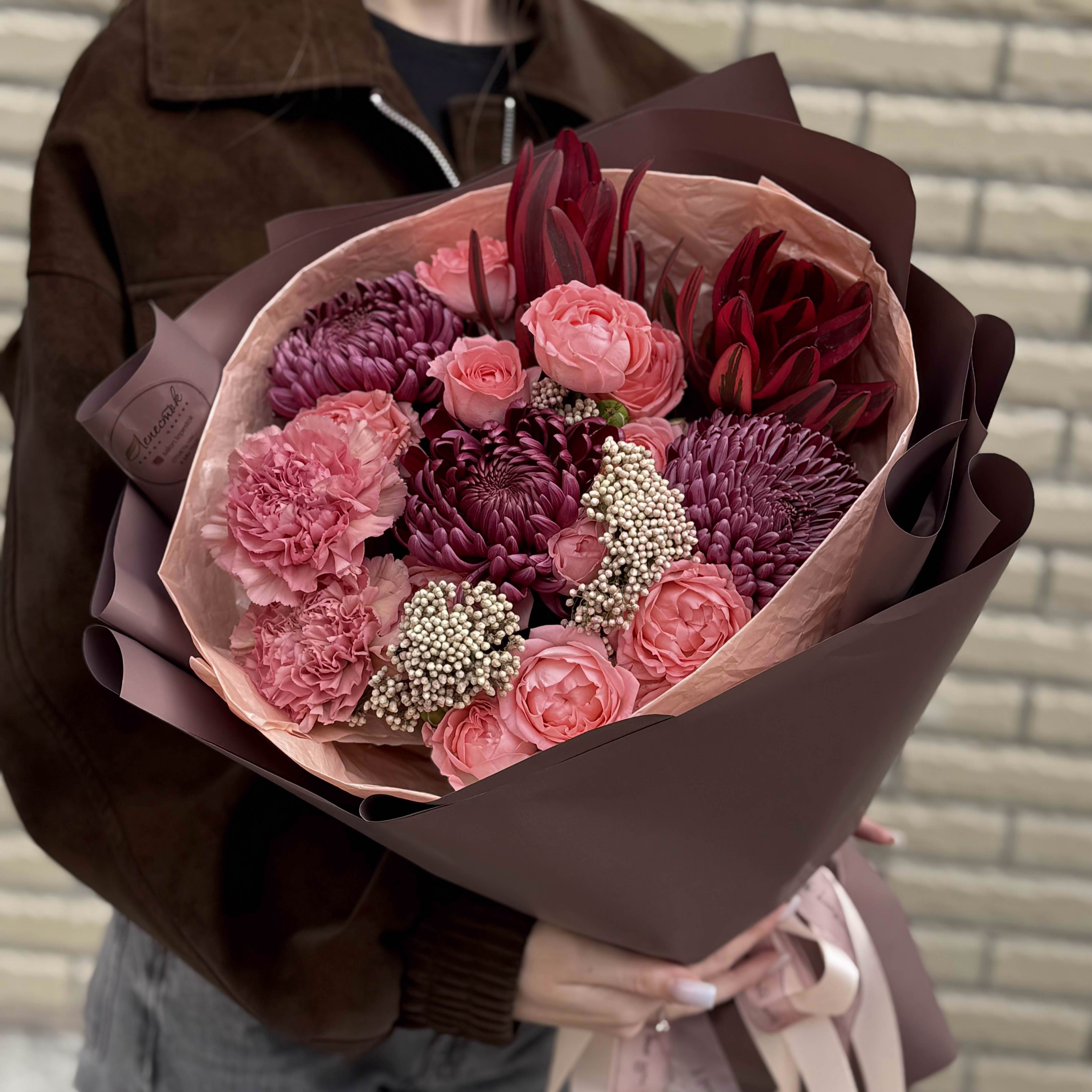 Леукодендрон, Одноголовая хризантема Бигуди, Пионовидная роза Фемке (Femke), Гвоздика Леге Пинк (Lege Pink), Озотамнус, Лента атласная, Стильная упаковка