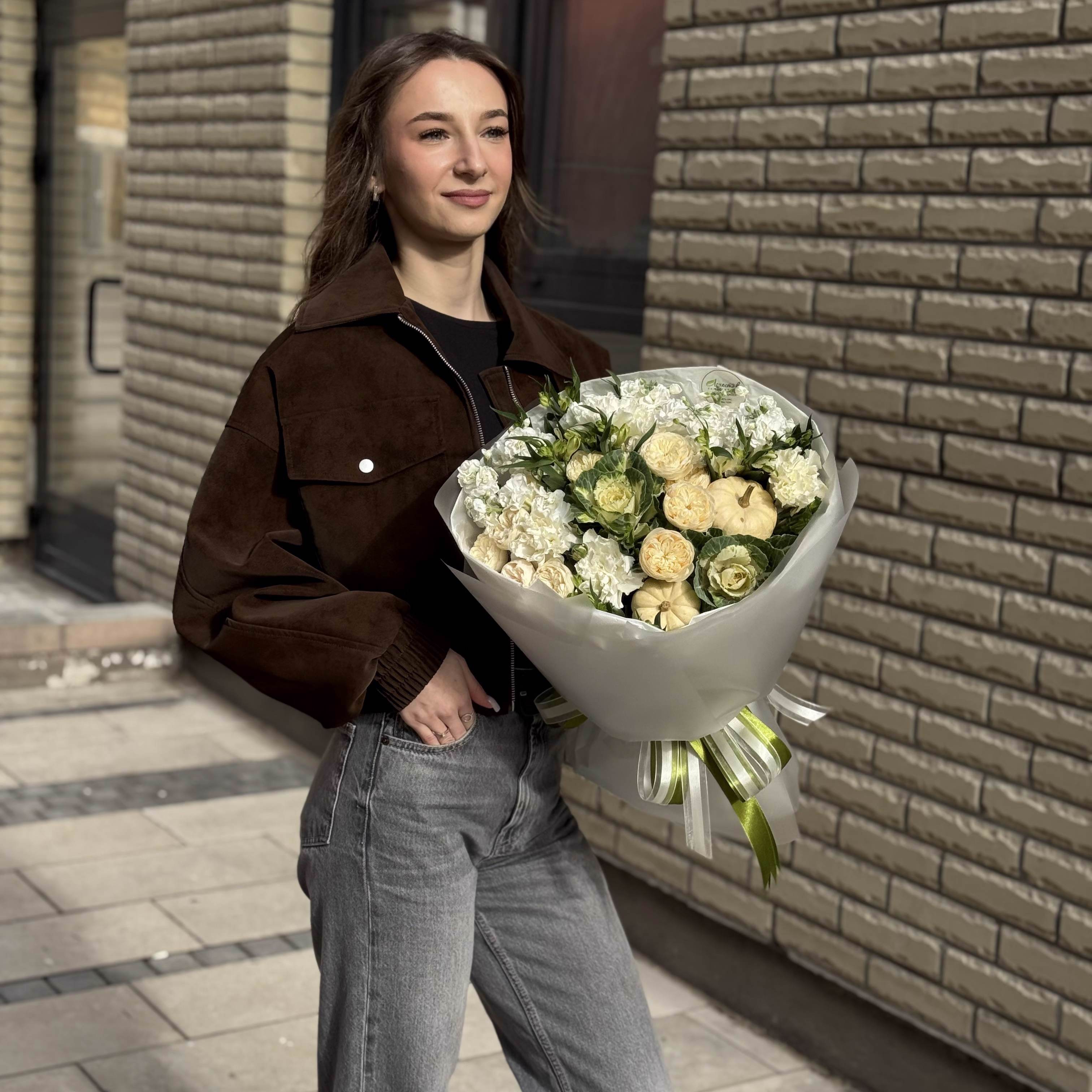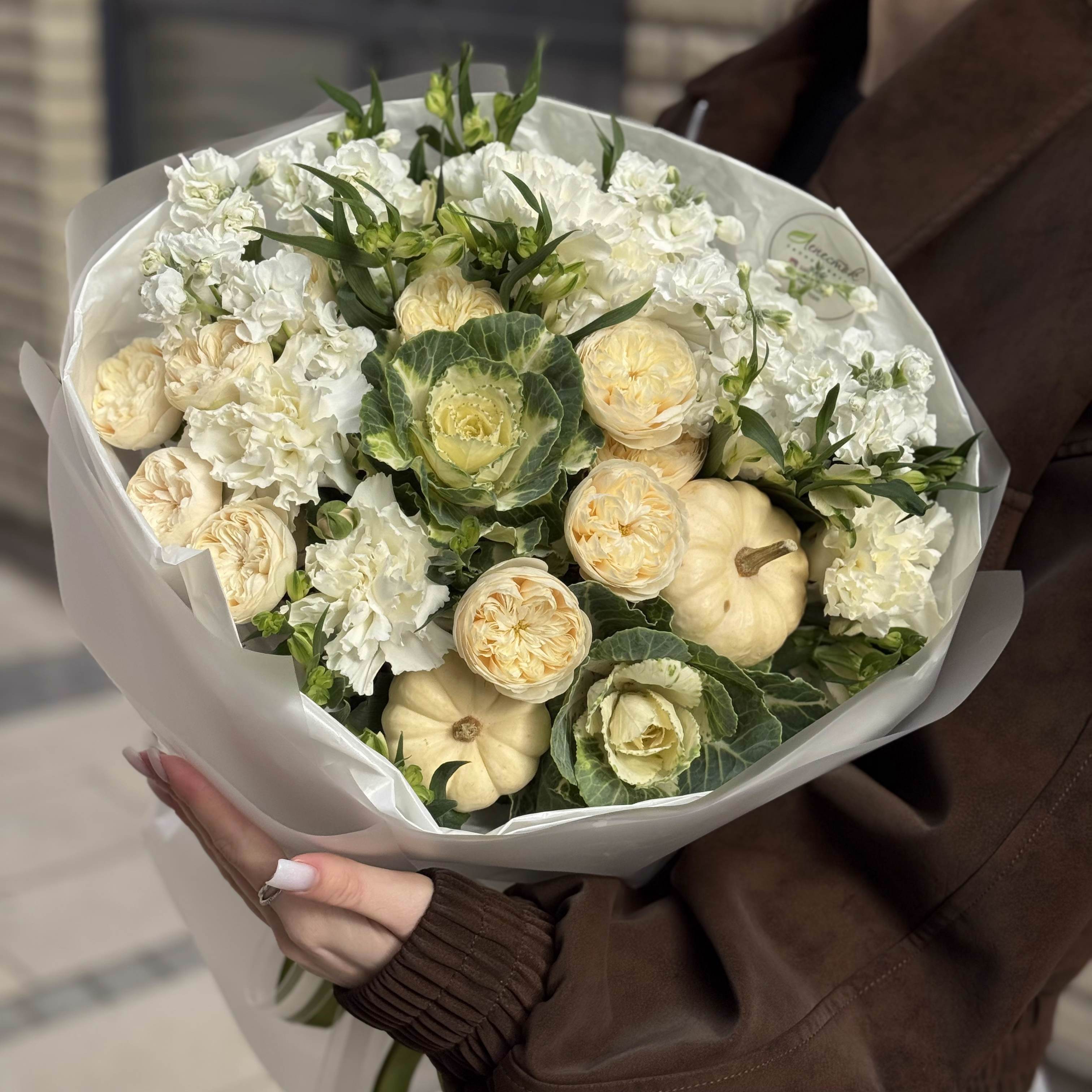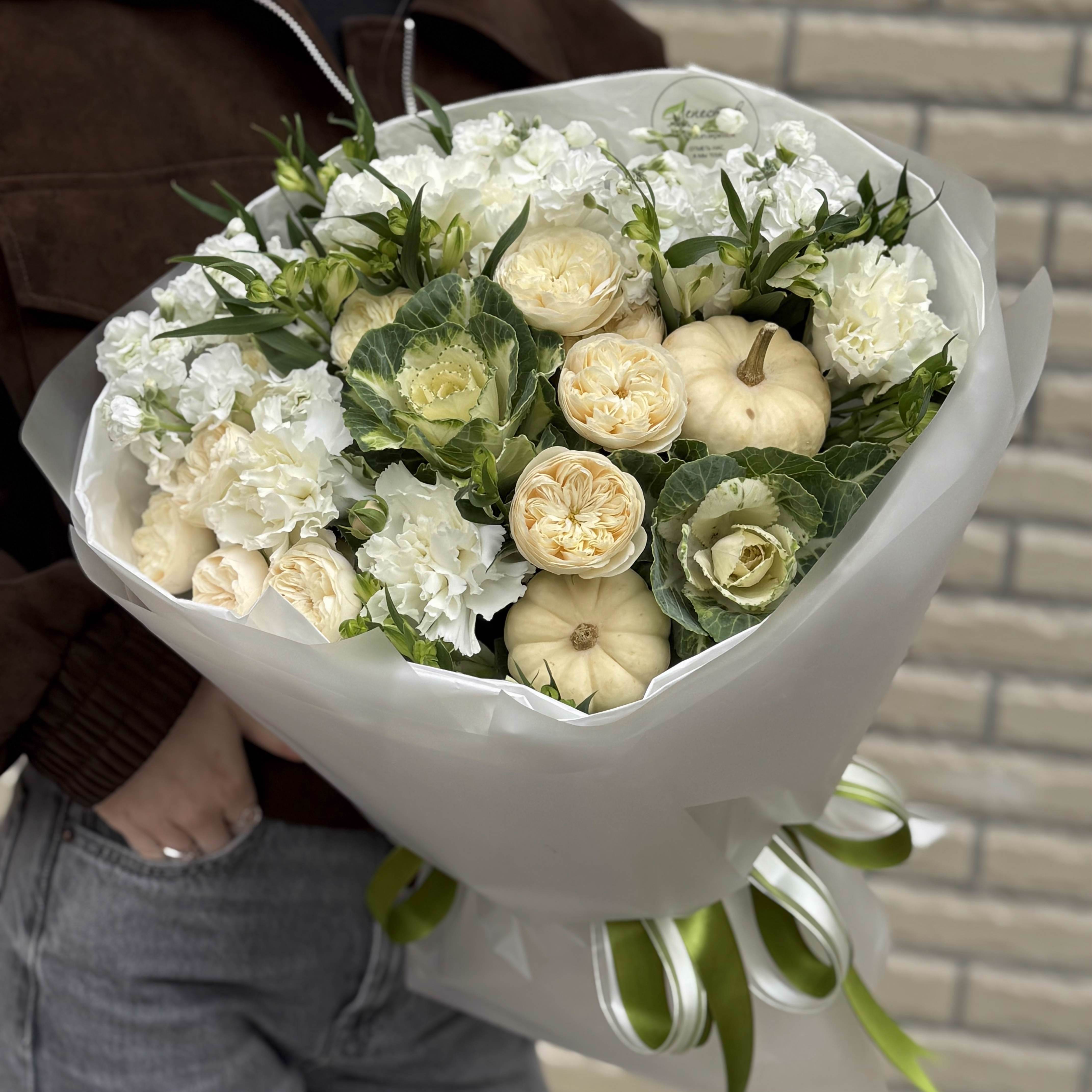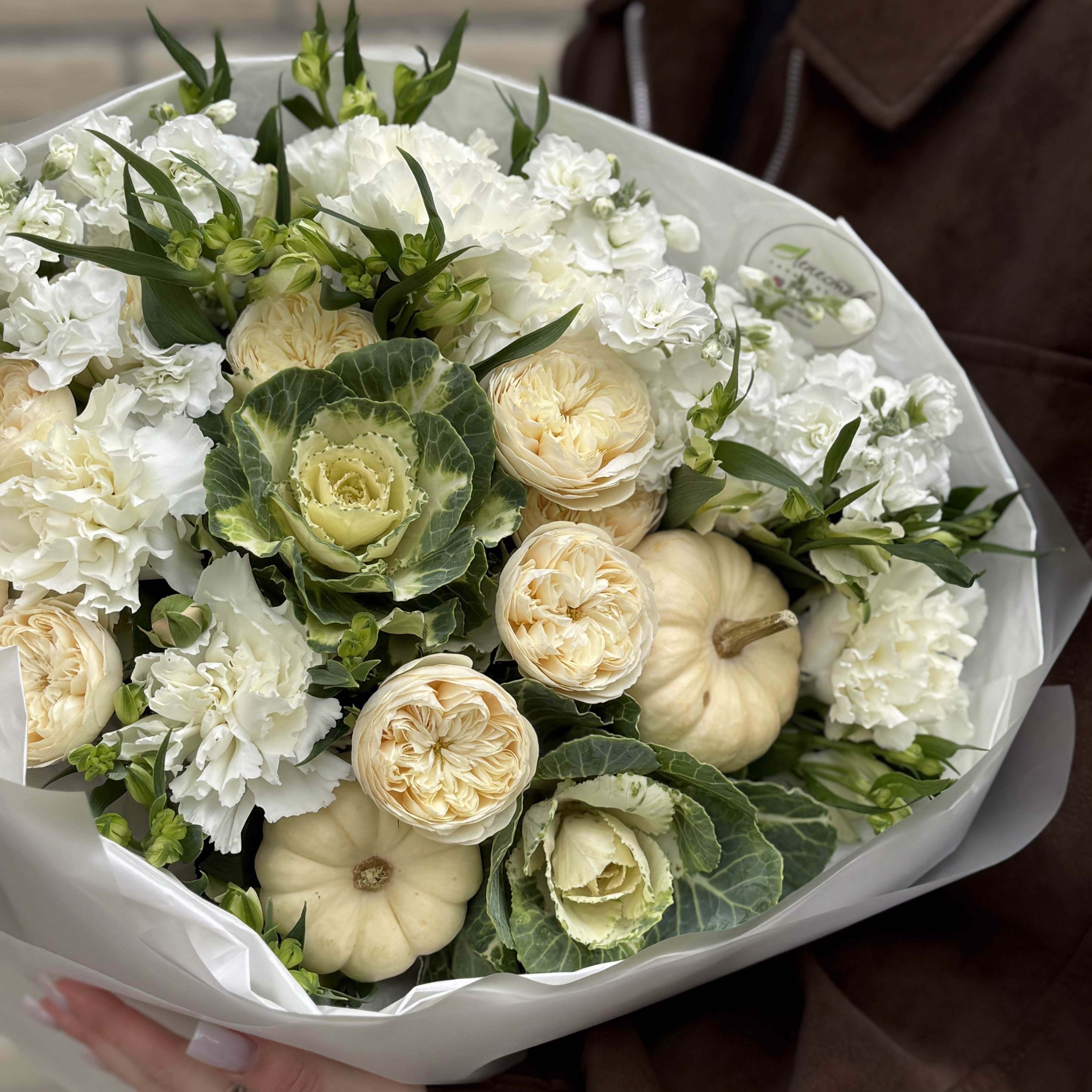 Стильная упаковка, Лента атласная, Маттиола Белая, Гвоздика одноголовая белая, Брассика фиолетовая , Альстромерия Шармелия, Тыква декоративная, Пионовидная роза Джентл Трендсеттер (Gentle Trendsetter)